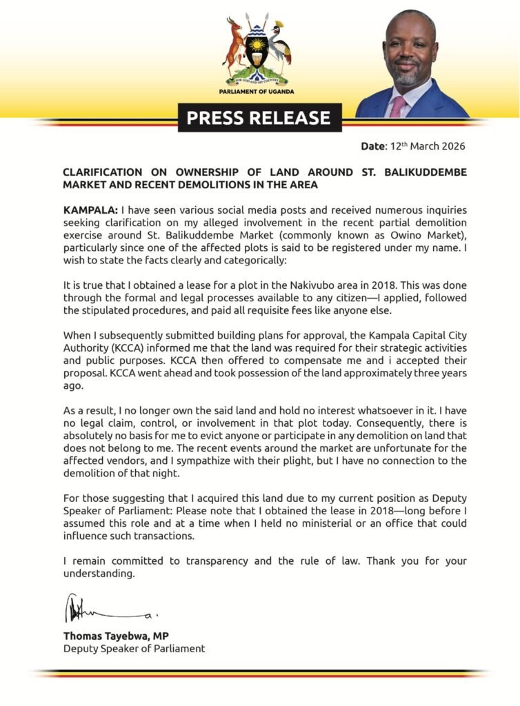 KAMPALA — The Deputy Speaker of Parliament, Thomas Tayebwa, has denied allegations circulating on social media that he was behind the demolition of structures near St. Balikuddembe Market.